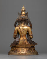 The sculpture is made of copper and adorned with 24K gold gilding, which adds a touch of divine beauty. The antique finish on the copper body adds depth and historical appeal to the statue, bringing out the delicate intricacies and tranquil elegance of Amitayus Buddha. The statue's size and weight make it a noticeable and meaningful presence, great for meditation, spiritual reflection, or as a soothing addition to any household.