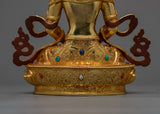 This statue, made of fine copper and gilded in 24K gold, exudes divine presence. It emanates devotion and grace as it is embellished with gold and acrylic paints and handcrafted gemstones. Weighing 1.64 kg, Amitayus' tranquil countenance and beautiful patterns make it an ideal complement to any meditation place or shrine.