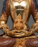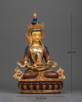 Our Amitayus Oxidized Figure will immerse you in the heavenly aura of longevity and vitality. At 15.7 inches tall and with a base diameter of 10 inches, this finely carved statue radiates spiritual strength and renewal. With its elaborate 24K gold gilding and gold acrylic paintings, as well as its construction from oxidized copper, every element of this piece embodies Amitayus's everlasting compassion and wisdom. Let the calm expression of this god encourage you to build a prosperous and healthy life that will support your spiritual development and long life.