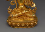 A copper body with 24K gold plating is skillfully crafted to create this lovely statue. Vibrant acrylic and gold paintings accentuate the fine features of Manjusri's countenance and the elaborate patterns on his clothing. The heavenly beauty is enhanced with hand-carved gemstones, which represent the spiritual significance of Manjusri. Its impressive presence and weight of 6.07 kg make it perfect for any area used for spiritual development, meditation, or self-reflection