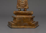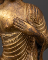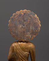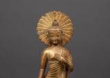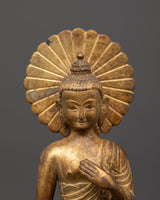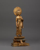 This 30 cm-tall Antique-Finish Shakyamuni Buddha Statue adequately represents the authentic Buddha, embodying peace, knowledge, and enlightenment. This standing figure, made from a copper body and finished in bright gold plating, symbolizes the Buddha's presence as a spiritual guide. It features flowing robes and a serene expression. The statue has a beautifully sculpted backplate that exudes heavenly energy and is set upon a graceful lotus base.