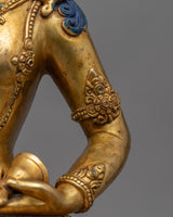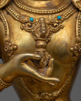 The Vajrasattva Mantra Benefits Practice was expertly hand-crafted in our workshop using a traditional Himalayan art technique. The deity is seen holding a bell in his left hand and a vajra in his right hand as he sits on a lotus on top of a moon disc. He had a serene facial expression on his face. We are the present heirs of a Buddhist Himalayan art form that dates back a century and entails the production of sacred sculptures. For months, we worked hard to produce this statue. The body is shaped from copper and gilded with 24K pure gold. The statue has an acrylic paint finish and is adorned with priceless coral and stones. Every intricate minute detail of the deity is hand-carved using a hammer and chisels.