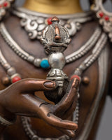 Presenting the Vajrasattva sculpture, a luminous representation of Vajrasattva, the principal deity linked with purification in Tibetan Buddhism and the embodiment of the Buddha's purity. This sculpture, which stands majestically at 13.3 inches tall with a base of 9.4 inches and weighs 3.88 kg, embodies the transformational power and peaceful grace of the Vajrasattva. This item, which is made of an oxidized copper body for a timeless finish and is embellished with hand-carved jewels, silver plating, and paintings in gold and acrylic, represents the profound process of spiritual rebirth and cleansing.