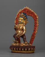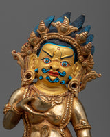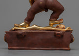 Crafted from a copper body and then gilded with 24k genuine gold. He is holding a mongoose, spewing wish-fulfilling diamonds, and a skull cup. The right leg is extended, pressing upon the yellow Lord of Wealth beneath his foot. A fiery halo rages behind the deity. The elegant gold-plated and acrylic-painted halo illuminates his face, while the wonderfully carved lotus seat is seen as mesmerizing.
