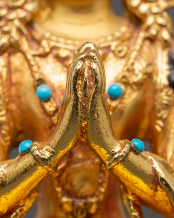 Invite compassion and serenity into your space with this Bodhisattva Chenrezig Handmade Statue, intricately crafted from gold-plated copper. Seated in a calm meditative pose with four graceful arms, Chenrezig, the embodiment of boundless compassion, radiates tranquility and divine elegance. Every facial detail is finely painted to express serenity, while turquoise and coral stones add a sacred vibrance to the crown and chest.