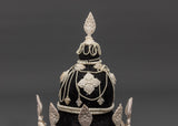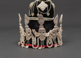 This Bone Ornament Set is a beautifully handmade collection of ritual jewelry created from responsibly sourced buffalo bone that honors the rich cultural history of Himalayan craftsmen. The ensemble comprises a crown, choker necklace, armlet, apron, long necklace, and earrings, all beautifully crafted to complement ceremonial clothing. The crown is 37 cm tall and 21 cm wide (0.836 kg), the choker necklace is 45 cm long (0.516 kg), the armlet is 84 cm by 69 cm (single weight 0.138 kg, total 0.278 kg), the apron is 84 cm by 69 cm (2.13 kg), the long necklace is 64 cm long (0.548 kg), and the earring set is 19 cm by 5.5 cm (total weight 0.102 kg). The total ensemble weighs 4.846 kg and combines aesthetic appeal with ritual utility. The intricate carving and polishing of the buffalo bone highlight traditional craftsmen's artistry and dedication, elevating this set beyond jewelry to a spiritual emblem.