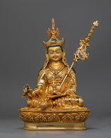 This sculpture was painstakingly crafted in Patan, the epicenter of Nepal's metalworking craftsmanship. It features a traditional copper body adorned with a stunning 24K gold gilding. This piece is a treasure of spiritual and artistic worth because of the precise gold and acrylic paints that capture the tranquil composure and enlightened aura of Padmasambhava.