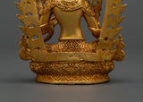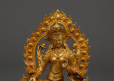 This copper statue of the Buddhist deity Green Tara, hand-carved with gold plating, represents the sacred feminine energy of compassion, protection, and swift action. This statue, measuring 11cm in height and 8cm in breadth and weighing 0.25kg, is an attractive addition to any spiritual space, altar, or house dedicated to mindfulness and healing practices.