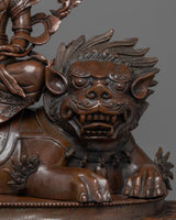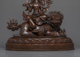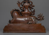 Hand-carved in our studio, this fine Nepalese artwork Buddhist line art will brighten any home or office space. It is meticulously carved and depicts Chenrezig, the powerful embodiment of compassion. With its impressive 19" height, it will last for generations. We have depicted the compassionate one on a moon disc of lotus sitting on magnificently handcrafted lion with calm and scenery expression. This statue weighs 18kg.