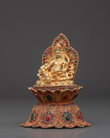 This Buddhist Prosperity Dzambhala statue, expertly carved from copper and embellished with exquisite gold plating, will bring prosperity and spiritual blessings to your sacred place. Standing 15.5cm tall, 13cm broad, and weighing 0.48kg, this magnificent artwork represents Dzambhala, the Tibetan Buddhist deity of riches and charity. This statue, which features intricate filigree work and is inlaid with imitation ruby and emerald stones, exudes holy energy and makes an appealing centerpiece for meditation rooms, prayer altars, and home décor.