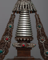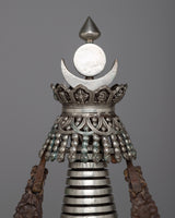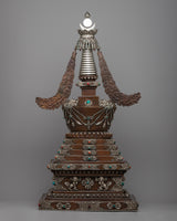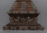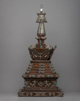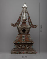 This shrine stupa is meticulously crafted from Copper and has a delicate silver plating, giving it a sense of respect and spirituality. Its substantial 36-cm width guarantees that it attracts notice and respect, acting as a center for reflection, prayer, and meditation.