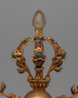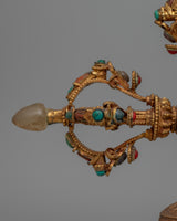 The Double Vajra Bell is a mesmerizing and spiritually significant ritual object. It is beautifully created from a Copper Body and Electro Gold Plated which is inlaid with crystal, turquoise, and Lapis Lazuli. This bell, which measures 25.5 cm in height and 26.5 cm in breadth, combines the features of a bell with a vajra, signifying the ideal balance of compassion and wisdom. The complete vajra in the center symbolizes the unwavering strength of truth, while the half vajra on top signifies the power of divine energies. When combined, these components suggest the equilibrium of energy and awareness that is fundamental to Buddhist teachings.