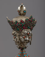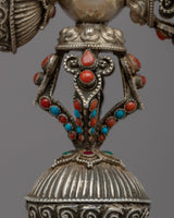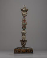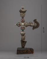 With our carefully handcrafted Buddhist Ritual Dagger, set out on a spiritual journey. High-quality silver was used to forge this exquisite phurba, guaranteeing its durability and aesthetic appeal. The dagger's intricately crafted blade is evidence of the expert craftsmanship used in its construction. A strong stand that comes with the phurba offers a stable display of this holy object. This Buddhist Ritual Dagger is a testament to the deep spiritual significance of the phurba and the rich cultural heritage of its use in ceremonial rituals and as a symbol of spiritual devotion.