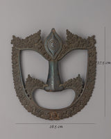 Our Buddhist Ritual Dance Mask, measuring 27.5 cm in height and 28.5 cm in width, is a beautiful Himalayan spiritual art. This mask, made of exceptional iron, captures the essence of the Tibetan Buddhist tradition, making it an effective addition to any altar, meditation space, or sacred wall décor. It weighs 0.31 kg and is portable and strong, making it ideal for display as a protective relic or ceremonial centerpiece. The delicate carvings capture the eternal beauty of Buddhist craftsmanship, transforming this mask into a symbol of divine strength and spiritual awakening.