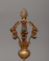 In Tibetan Buddhism, the ritual bell (Drilbu) represents the feminine essence of wisdom and emptiness, resulting in a sacred balance of method and insight. The gold-plated finish heightens its divine presence, while the turquoise and coral accents symbolize protection, prosperity, and spiritual clarity. During Buddhist rituals, the vajra and bell are used to create harmonic vibrations that cleanse negativity, invite divine favors, and deepen meditation techniques.