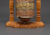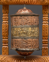 The body, crafted from copper and brass, is both significant and highly detailed, weighing 0.78 kg. This prayer wheel is designed to spin smoothly within its elegant wooden frame, enhancing the spiritual ambiance of any altar, shrine, or meditation space.