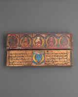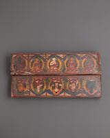 This Buddhist Sacred Text Protector, a stunning fusion of spiritual symbolism and traditional craftsmanship, will help you honor and protect your sacred scriptures. This sacred book cover, measuring 34.5 cm in width and 8.5 cm in height, is designed to preserve Buddhist teachings with care and respect.  Its surface is adorned with three intricate Buddha figures that represent wisdom, protection, and spiritual awakening.  This precious artifact is more than just a protective cover; it is a devotional piece intended to preserve the teachings of enlightenment.