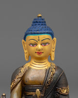 The Buddhist Sculpture of Healing Buddha is a depiction of Bhaisajyaguru, the Medicine Buddha, who is renowned for his healing abilities and boundless compassion. This tiny statue, measuring 4.1"/10.5cm (Height) by 2.8"/7cm (Base) and weighing 0.230 kg, is ideal for personal altars, meditation places, or as a spiritual treasure. This item is expertly crafted from oxidized copper, featuring 24K gold gilding and intricate acrylic paintings that radiate a divine aura.