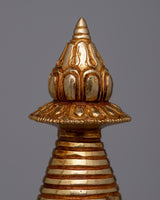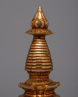 This stupa, which was carefully crafted, captures the profound symbolism and ageless beauty of Tibetan Buddhism. The Gold Plating provides a touch of grandeur and spiritual importance, while the Copper body guarantees authenticity and durability. This makes it a treasured focal point for any shrine or meditation area.