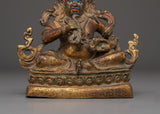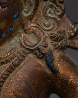 This statue's copper body features beautiful details on the deity's face, clothes, and lotus pedestal underneath him. The gold-plated embellishments show Dzambhala's brightness, while the surrounding decorations represent his wealth-bringing abilities. This statue is not only a magnificent work of art, but it also functions as a spiritual instrument, enriching the atmosphere of any holy space or home altar by invoking the blessings of prosperity and protection.
