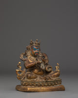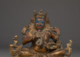 This Buddhist statue of Dzambhala is a magnificent depiction of the Tibetan Wealth Deity, known for his ability to remove obstacles and provide prosperity. This handcrafted statue measures 14cm in height, 15cm in width, and weighs 1.21kg. It is made of copper and has a rich, antique finish. Dzambhala is depicted in his wrathful form, clutching a mongoose that spits gems, which symbolizes the continual flow of prosperity, spiritual richness, and good fortune. His furious visage, paired with his serene, seated position, conveys the energy's protective and transformational properties.