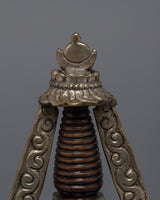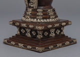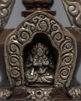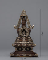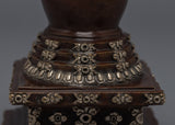 This beautifully crafted stupa is a handmade masterpiece created with exquisite attention to detail by skilled artisans. Made with a Silver plated finish, it features an intricately designed statue that is crafted onto the bumpa. The stupa symbolizes enlightenment and peace, and its elegant design and silver finish make it an excellent addition to any home or meditation space. The statue on the bhumpa adds an extra layer of spiritual significance to this already remarkable piece. This stupa is a perfect way to bring a sense of calm and tranquility to any environment.