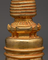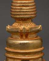 This finely constructed stupa is 20cm tall, 9.5cm broad, and weighs 0.83kg. This sacred item, made of copper and finished in bright gold plating, is a potent symbol of enlightenment and spiritual progress in the Buddhist faith. Its design and intricacy are perfectly matched, making it excellent for any altar or meditation room.