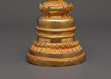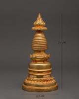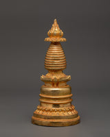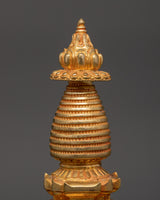 The stupa's tiered foundation and intricate ideal represent the path to awakening, with each element symbolizing a distinct stage of the journey toward enlightenment. The bright gold finish enhances its visual appeal while reflecting the divine light and spiritual purity associated with Buddha's teachings. It is a spiritual tool and a beautiful treasure, rooted in Himalayan craftsmanship and rich meaning.