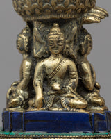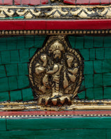 A Buddhist stupa is a spiritual monument and a location of meditation that is a symbolic reflection of Buddha's enlightened mind. This Buddhist stupa art piece is created on a Brass body with fine workmanship and gorgeous jewels inserted. This stupa stands out by the presence of Buddha statues, one on each of the stupa's . The stupa is more than just a decorative object; it is a Buddhist symbol with spiritual importance and meaning. This sculpture would look great in a meditation space or a place of worship.
