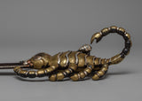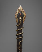 Ritual tools are vital equipment of Tibetan Vajrayana Buddhism practice, meant to dispel misconceptions that obstruct enlightenment. The phurba (Sanskrit: Kila) blade seen here was created to symbolically swallow the three poisons that obstruct spiritual progress: ignorance, greed, and illusion. The Phurba is the physical manifestation of the Vajrakila Buddha, who can destroy all evil on the earth. Its ceremonial usage is first recorded in the Vajrakilaya Tantra, an eighth-century or older Vajrayana work.