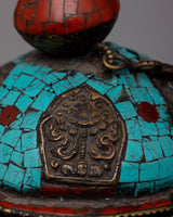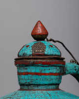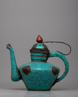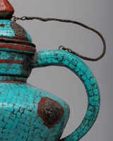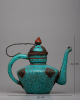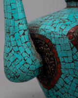 Presenting the Buddhist Tea Pot Kettle—a fascinating fusion of design and use. Its design, which is handcrafted on a copper body and features strategically placed flat-cut turquoise and coral stones, exudes a captivating charm. Although it's a beautiful accent to any interior design concept, its main function is decorations.