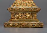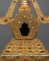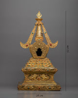 Our Stupa is meticulously crafted and has finely inlaid gemstones, providing a touch of luxury and solemnity to its design. As a premium stupa, it serves as a focal point for devotion and meditation, beckoning practitioners to engage with the heavenly powers it represents.