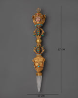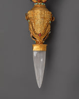 The Buddhist Three-Sided Phurba is an elegant ceremonial dagger crafted from gold-plated copper, featuring a transparent crystal blade and a turquoise stone. It measures 57 cm in height and 10 cm in breadth, making it an excellent tool for energy work, tantric ceremonies, or as a powerful spiritual centerpiece. The powerful deity, engraved into the handle, represents protection and transformation during holy rituals.