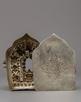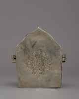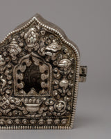This beautifully handmade Ghau Box is composed of 95% pure silver and elaborately carved with traditional Tibetan patterns such as Ashtamangala (Eight Auspicious Symbols) and Norbu (Wish-fulfilling Jewel). This tiny and lightweight item is 8 cm in height and 7.5 cm in width, and weighs only 0.09 kg. It is great for carrying personal relics, amulets, or prayer scrolls. Its elaborate front contains an artistically carved front with symbolic symbols, while the back has a beautifully carved bishwo vajra for extra spiritual meaning.