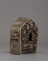 This Ghau box, traditionally used as a portable shrine, contains blessings that provide the wearer or keeper with protection and heavenly energy. Its artistry and cultural authenticity make it an ideal spiritual adornment or thoughtful gift for Tibetan Buddhists. This silver Ghau box, whether taken on a journey or set in a sacred spot, is an eternal expression of creativity and dedication.