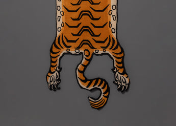 The tiger design is significant in Buddhist culture. It represents unconditional confidence, disciplined awareness, kindness, and modesty. Associated with dominance over the forest and linked to the air element, the tiger is seen as a guardian spirit. Many Tibetans believe that meditating on a tiger carpet can protect practitioners from negativity while enhancing focus and clarity during spiritual practice. Its bold stripes and fierce expression make this rug a source of both inspiration and protection.