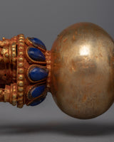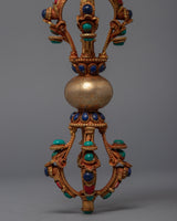 A vajra ritual item is a double five-pronged vajra with three flames on all but the central prong. Two rings of linked lotus petals make up the grip's central portion. The Sanskrit word vajra signifies a lightning bolt. Different deities from the Hindu and Buddhist traditions carry it as a weapon. The central symbol of esoteric Buddhism is the vajra because enlightenment can strike with a similar rapid, forceful, and exact blow that shatters ignorance and other forces of darkness. Lightning is pure energy that strikes with speed, power, and precision.