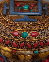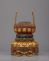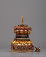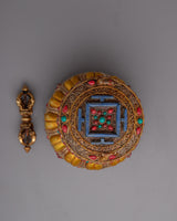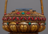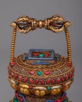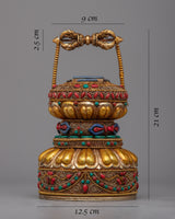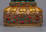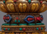 The Buddhist Vajra is a sacred and powerful symbol that has been cautiously handcrafted on a copper body with 24k gold and silver plating. The Vajra stand is embellished with embedded gemstones and has intricate details that add a touch of elegance and beauty. It comes with a long and big stand which had a length of 21cm with the vajra for easy display. The vajra symbolizes the indestructible and unchangeable nature of enlightenment, making it an indispensable tool in Buddhist rituals and practices. Its craftsmanship and symbolism make it a prized possession for both spiritual practitioners and collectors.