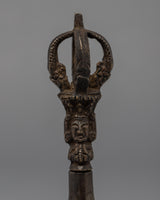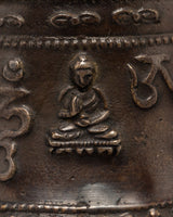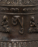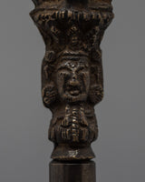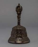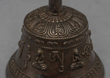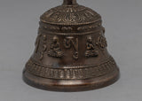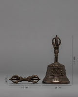 This brass Vajra and Bell set is an important ritual tool in Tibetan Buddhism. The Vajra, symbolizing indestructible spiritual power, and the Bell, representing wisdom and emptiness, are held during religious ceremonies. Crafted with exquisite detail, both the Vajra and Bell are made of brass, making them sturdy and long-lasting. The standout feature of this set is the intricate carving of a deity and mantra on the waist of the Bell, adding an extra layer of spiritual significance to the piece.