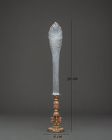 This Tibetan Vajra Sword is a symbolic guardian, typically used in Buddhist rituals to cut through bad influences and defend sacred sites. The copper handle features beautiful patterns that depict a harmonic mix of force and peace, while the iron blade is strong. This Vajra Sword symbolizes a deep devotion to spiritual progress and clarity, whether displayed as spiritual decor or utilized in tantric rituals. Elevate your spiritual practice with this unique handcrafted item that combines traditional Tibetan artistry with metaphorical meaning. The Buddhist Vajra Sword is more than an item; it is a spiritual guide to enlightenment.