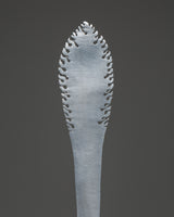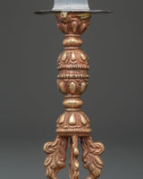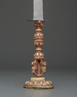 Ritual tools are vital to Tibetan Vajrayana Buddhism practice, meant to dispel misconceptions that obstruct enlightenment. The phurba (Sanskrit: Kila) blade seen here was created to symbolically swallow the three poisons that hinder spiritual progress: ignorance, greed, and illusion. The Phurba is the physical manifestation of the Vajrakila Buddha, who can destroy all evil on the earth. Its ceremonial usage is first recorded in the Vajrakilaya Tantra, an eighth-century or older Vajrayana work.