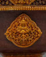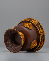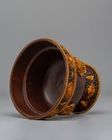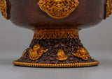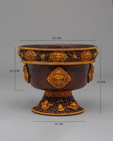 The exquisitely carved Buddhist Water Offering Bowl Set is intended for use in religious ceremonies and offerings. This set, which combines traditional workmanship with religious intent, is made with an oxidized copper body and completed with gold plating. The dimensions of each bowl are 13 cm in height, 11 cm in base, and 16 cm in diameter, which makes them ideal for the Buddhist spiritual practice of water offerings. The 9.5 cm inner depth, which stands for purity, clarity, and the flow of compassion, permits a sizable amount of water or additional contributions.