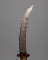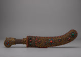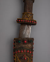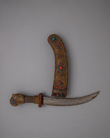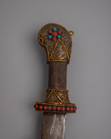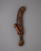 The white metal construction gives a strong and long-lasting foundation, though the coral and turquoise stones add brilliant color and complex craftsmanship. These stones are frequently connected with protection, healing, and spiritual clarity in Buddhist cultures. This knife's design symbolizes a rich cultural legacy, and its exquisite craftsmanship makes it an excellent addition to any collection of sacred things or a meaningful instrument for spiritual practice. Its graceful and symbolic nature makes it an effective reminder of Buddhism's ideals and teachings.