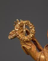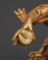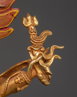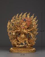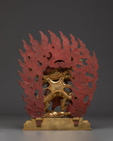 The 4.53 kg statue is rich in detail and spiritual significance. Its dynamic pose within a blazing aureole symbolizes transformation and purification. Each of the six arms bears traditional implements representing the conquest of demons and the transformation of affliction into wisdom. The golden finish and vibrant hues are striking, ideal for prominent display on a ritual altar, temple setting, or spiritual shrine.