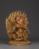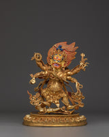 This Buddhist Wrathful God Statue, embodying ferocious compassion and enlightened protection, depicts a six-armed guardian deity from the Vajrayana tradition. Standing 34cm tall and 27cm broad, this commanding figure is meticulously constructed from a copper body, then gold-plated and hand-painted with acrylic details to highlight every ferocious expression and sign. This vengeful god, frequently linked with Mahakala or Vajrakilaya, shields practitioners from evil energies, egoic delusions, and inner impediments.
