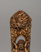 Vajrayogini is the central figure in Buddhist artwork, representing wisdom, spiritual strength, and the ability to transform negative energy into reasonable force. Above her, the Dragon head represents power and protection, and it is frequently portrayed as a guardian against obstacles. The Dharma Wheel at the base symbolizes the Buddha's teachings, the path to enlightenment, and the cycle of life. Vajrayogini's position and presence reflect her function in spiritual activities, assisting practitioners through purification and empowerment. This Buffalo Bone Vajrayogini wall décor is an effective tool for anybody seeking spiritual transformation, empowerment, and protection, as it invites the wisdom of Vajrayogini into your holy area.