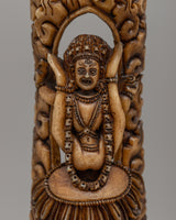 Our 15.5cm tall and 4.5cm broad Buffalo Bone Vajrayogini Wall Decor is made of ethically obtained buffalo bone, a material chosen for its strong link to natural energy and spiritual resonance. Buffalo bone is recognized for its strength and cleansing powers, making it an excellent choice for a Vajrayogini statue, which depicts the Buddhist deity of transformation. This wall decor's modest size makes it ideal for altars, meditation rooms, or any other area dedicated to spiritual practice, providing a stabilizing presence and tremendous energy to those seeking spiritual clarity and protection.