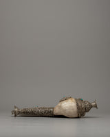 With a combination of workmanship and talent, the Carved Conch Shell emerges as a symbol of timeless beauty. Its copper body, adorned with a silver-plated finish, exudes understated beauty, while the detailed carving of a dragon gives a sense of mysticism and power. Turquoise stones, adorn its surface, giving it a celestial atmosphere that captivates the eye and stirs the soul.
