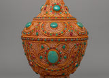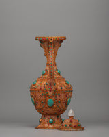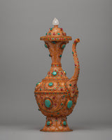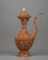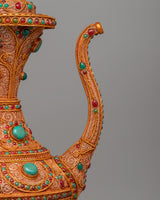 The filigree work on the ewer showcases exceptional craftsmanship. Delicate patterns flow along its body, creating a sense of movement and fluidity. The fine details around the spout, handle, and base make this ewer stand out as a ceremonial object, likely used in traditional rituals or offerings. The use of artificial stones, particularly the combination of turquoise and ruby, suggests that this ewer is not just decorative but also a symbol of spiritual and material wealth, with the stones often representing protection, vitality, and prosperity.