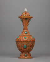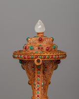 A small, circular, translucent stone is placed at the top of the ewer, likely symbolizing purity or the divine presence. The Ceremonial Ewer's overall design blends artistic beauty and spiritual significance, making it a powerful and elegant object in any ceremonial setting. With its rich texture and colorful embellishments, it has timeless appeal while also speaking to the traditions and rituals it may have been crafted for. The balance of vibrant stones and intricate detailing ensures that this piece is visually stunning and deeply symbolic.
